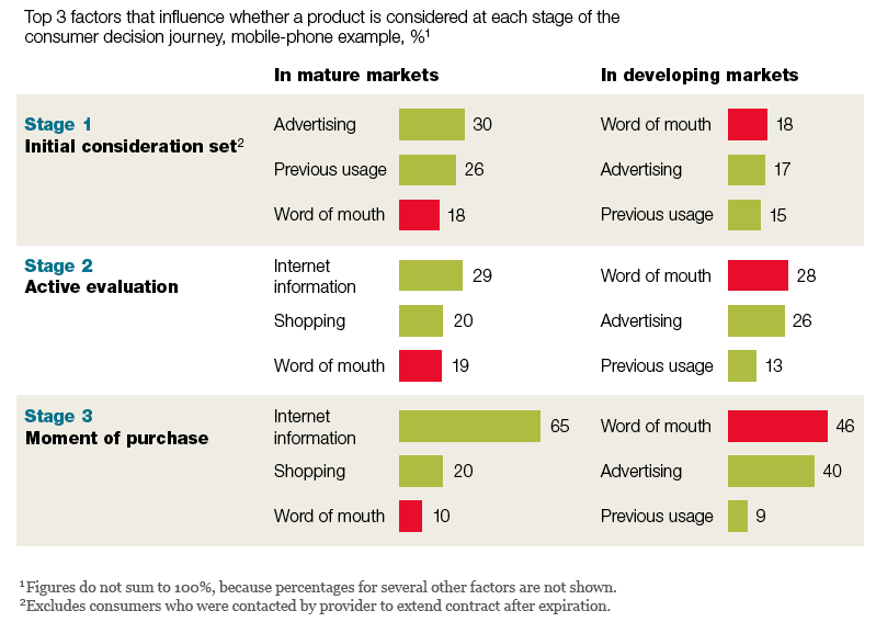 WOM of Friends and Family is far more powerful in China and other emerging markets, compared to developed markets. A McKinsey study on mobile phones purchase showed that WOM was the leading factor at all stages of the consumer decision journey in developing markets, while in mature markets it was no. 3 (refer figure below).